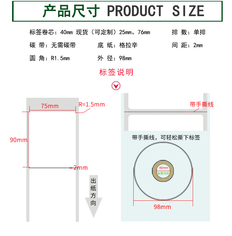 【標(biāo)簽間距】2mm、圓角R=1MM、卷芯寬度:40mm