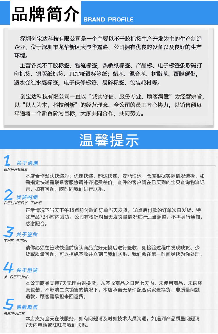 適合不同氣候地區(qū)使用,適用電子電器、五金塑膠、服裝、醫(yī)藥、日化、食品、商超、倉儲(chǔ)物流、資產(chǎn)管理、條碼標(biāo)識(shí)、外箱貼紙等長(zhǎng)期保存的產(chǎn)品標(biāo)簽及外箱標(biāo)簽同時(shí)也可以用于長(zhǎng)時(shí)間保存(配合碳帶)的亞馬遜、郵政國際、物流標(biāo)簽、郵政包裹、EBAY、速賣通、遞四方、出口EUB標(biāo)簽、出口電商等標(biāo)簽