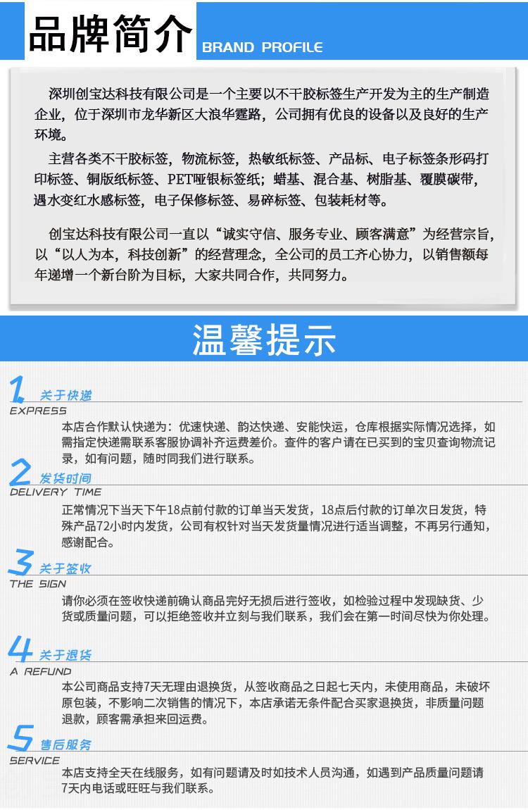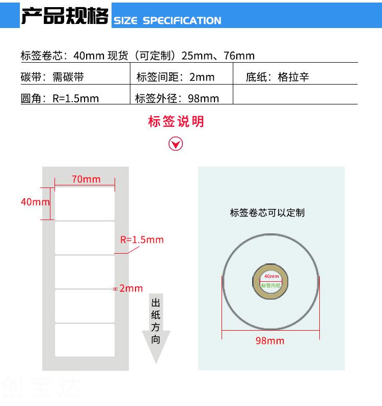 適合不同氣候地區(qū)使用,適用電子電器、五金塑膠、服裝、醫(yī)藥、日化、食品、商超、倉儲物流、資產(chǎn)管理、條碼標(biāo)識、外箱貼紙等長期保存的產(chǎn)品標(biāo)簽及外箱標(biāo)簽同時也可以用于長時間保存(配合碳帶)的亞馬遜、郵政國際、物流標(biāo)簽、郵政包裹、EBAY、速賣通、遞四方、出口EUB標(biāo)簽、出口電商等標(biāo)簽