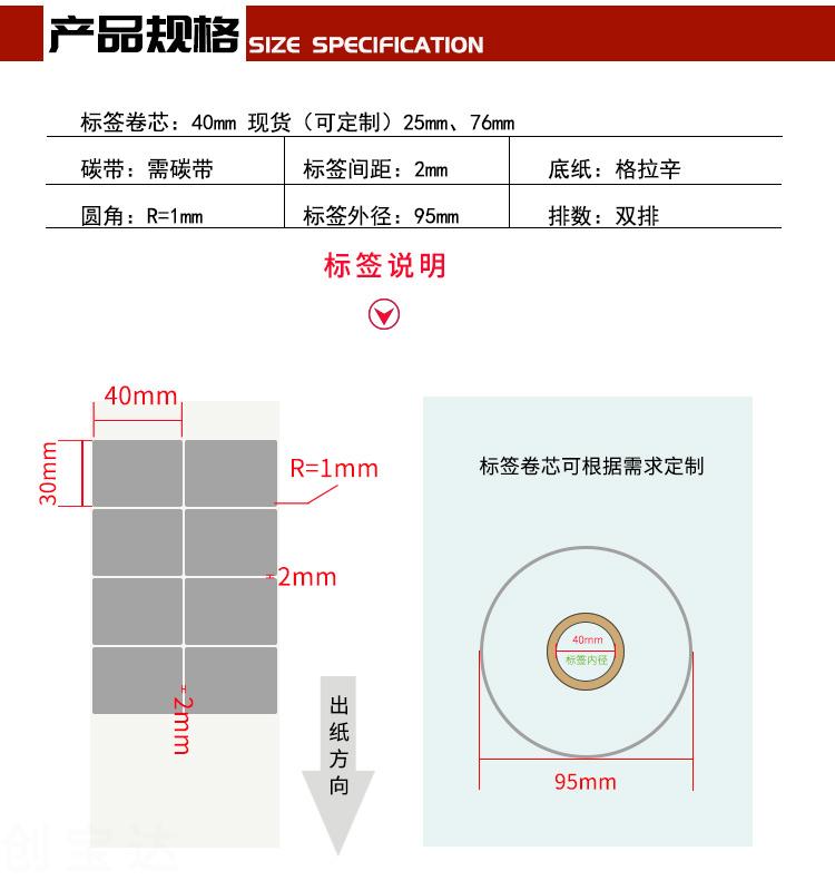 【規(guī)格】40mm*30mm*3000張/卷(足數(shù))36卷/箱